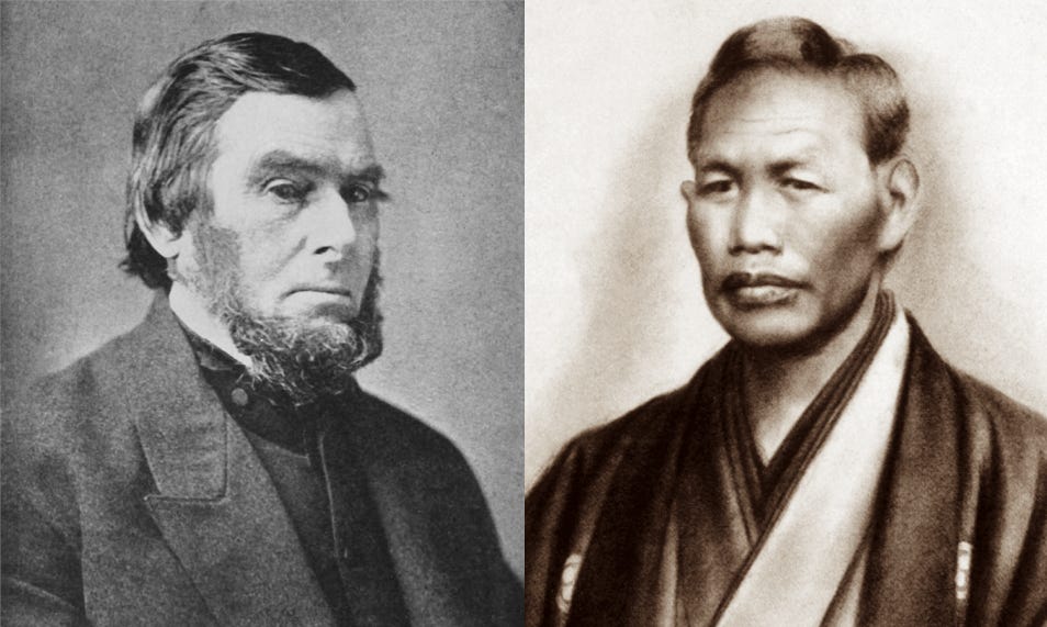 As if the previous dozen years were not adventuresome enough, the next phase of his life was to be even more so. Because of Manjiro’s familiarity with western customs and technology and the English language, he was granted samurai status and began to tutor young men of the clan who ruled his village. Following Commodore Matthew Perry’s first visit to Japan in 1853, Manjiro was summoned to Japan’s capital to share his knowledge of the West with the government officials. He was elevated to a higher samurai rank and was allowed to take a family surname, something not allowed to commoners. He became Manjiro Nakahama and served to enlighten the Japanese in matters relating to America.